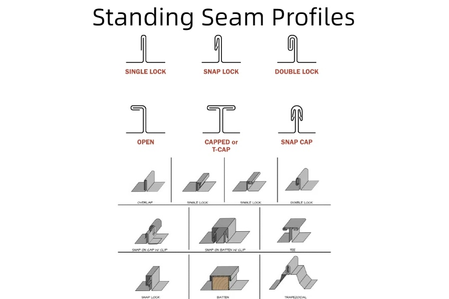 Standing seam panels feature raised vertical seams that interlock or snap together. These profiles can be mechanically seamed or snap-locked, and they come in a variety of widths and seam heights. Common profiles include: