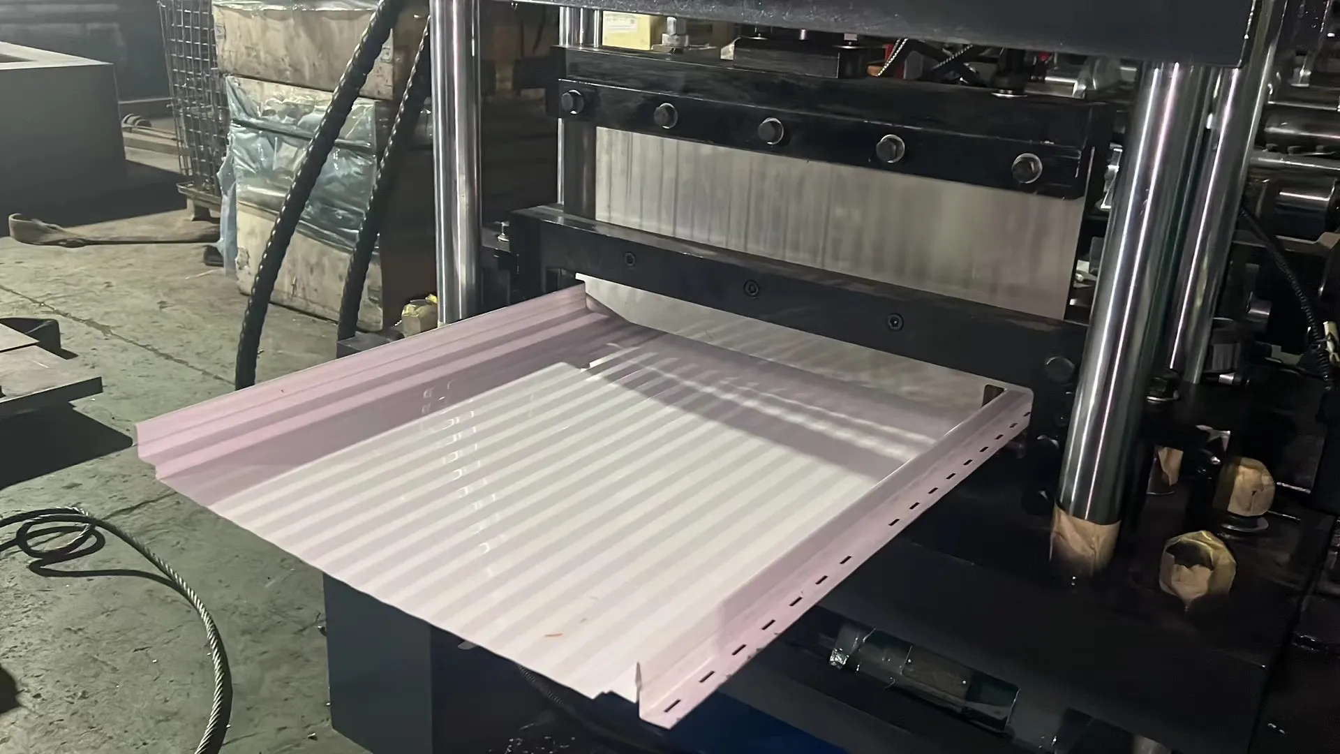 Roll forming stations – rollers gradually form standing seam profile.