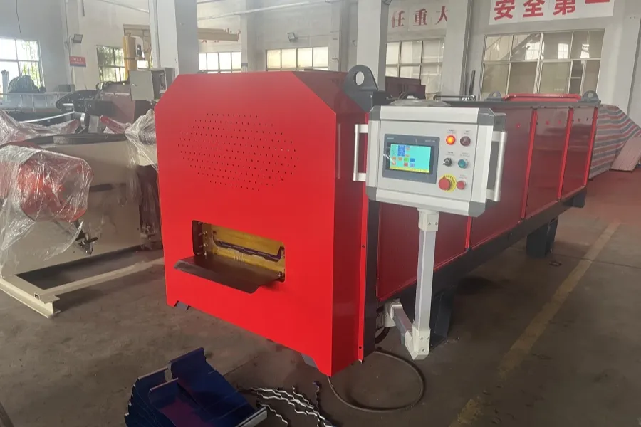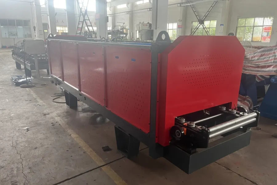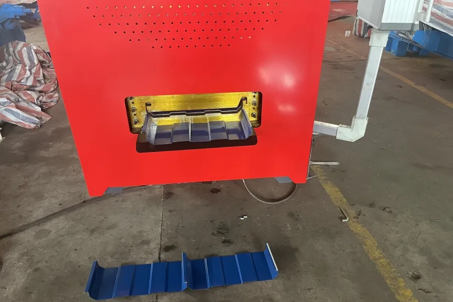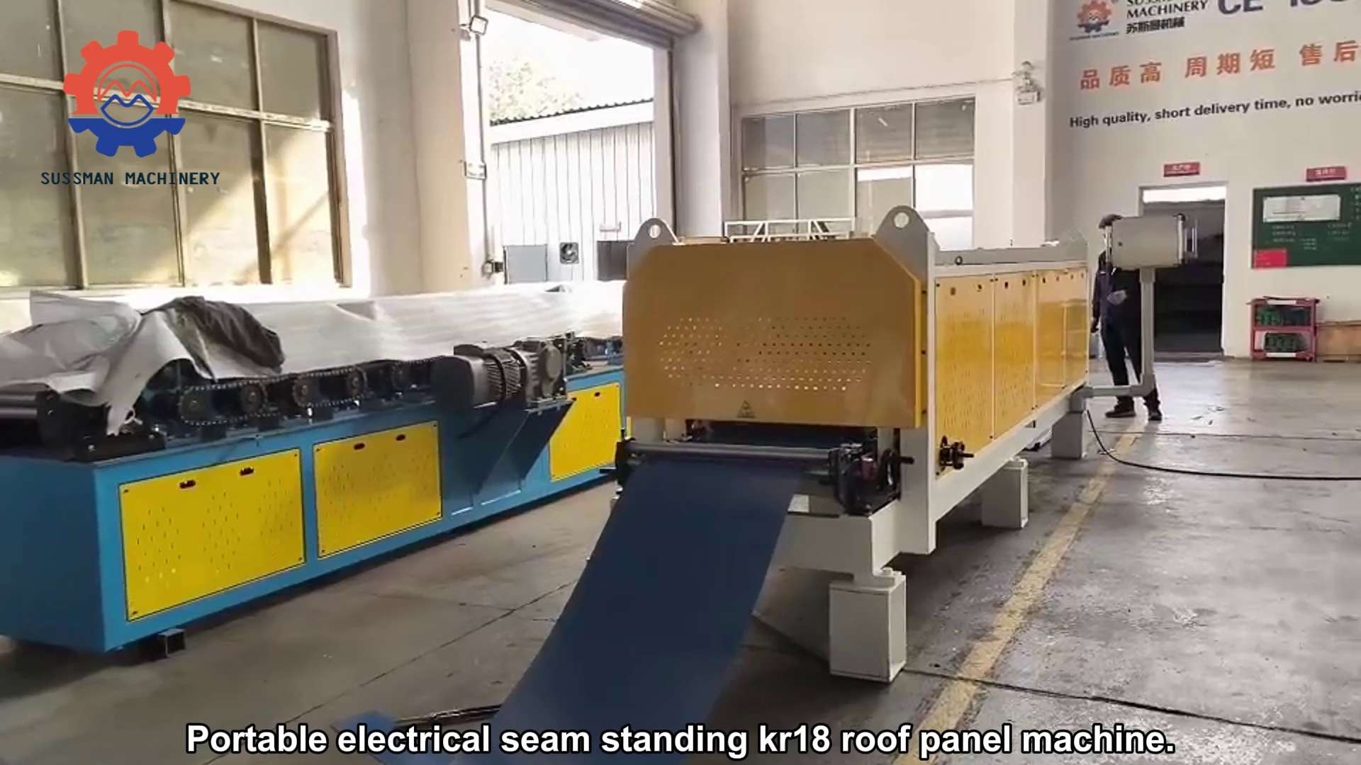 info@suhangmachine.comThis machine is for our client from Costa Rica. It has a 3 ton passive decoiler, main roll forming machine, 3 passive output tables, control system(PLC+touch screen), safety cover and tool box. To assemble the panels, you need to use the seam machine. Usually 5-roll seaming machine is available.