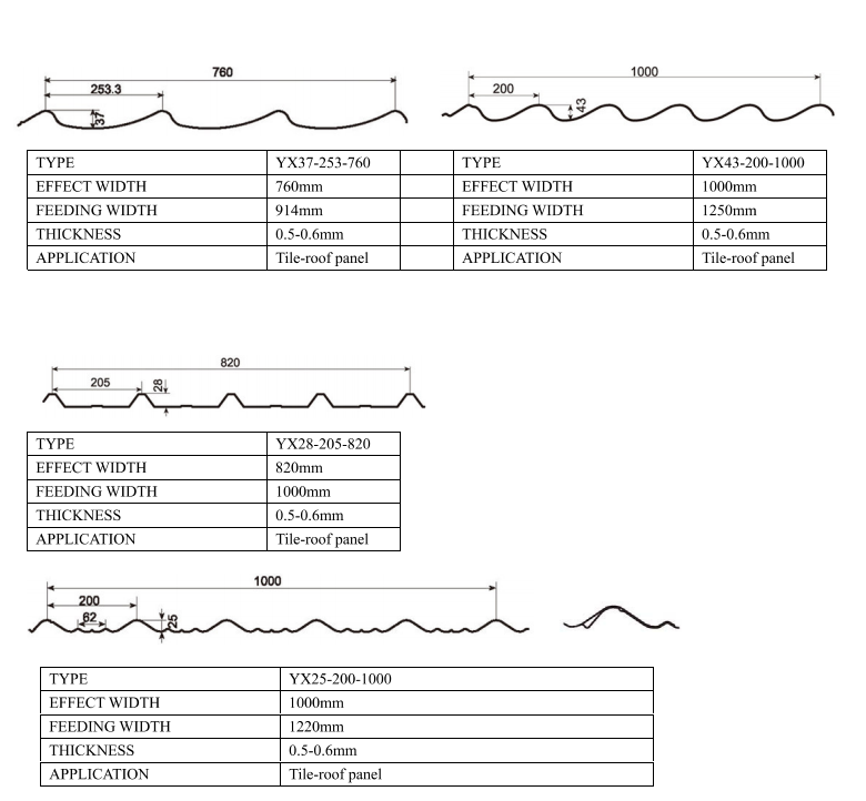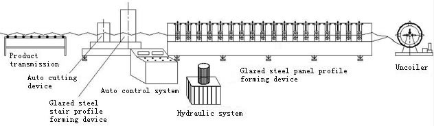 Un-coiler: Un-Coiler: 5 ton manual De-coiling Holder: 2200mm×1620mm×1700mm inside diameter of the uncoiler:510-610mm Roll forming machine: Color Steel Sheet Thickness: Color Sheet 0.3~0.8mm Color Steel Sheet width: 1220mm Roller Stations: about 13 stations Way of Drive: Gearbox Drive The speed of the roll forming machine:0-15m/min Roller Material: 40Cr steel, coated with chrome Shaft Material and DIA:76mm, material is 45# forge steel Maim Motor Power: 7.5kw Error of Cutting Distance of Glazed Tile: ±1-2mm Roll Forming Machine: 8700mm×1622mm×1400mm Roll Forming Machine: 8000kg Press parts: Type: Hydraulic Hydraulic Station Power: 4kw Size of the press parts: 2000*1800*1500mm Cutting parts: Type: Hydraulic Max. Cutting thickness: 0.8mm Hydraulic Station Power: 5.5kw Automatic Hydraulic Cutting Machine: 400mm×1500mm×1100mm Material Of Cutting: Cr12Mov quenching 58-62℃ Automatic Hydraulic Cutting Machine: 400kg